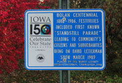 Sixteen residents of Bolan appeared as guests on Late Night with David Letterman, Wednesday, March 1, 1989. This was the result of Chuck Offenburger, the Des Moines Register’s “Iowa Boy” covering events and writing about Bolan in his column such as "Bitsy Bolan Boasting a Big Centennial Bash" with a Stand Still Parade in 1986; RAGBRAI, the Register’s Annual Great Bicycle Ride Across Iowa being routed through in 1987; and the Register hosting a “Back-To-Bolan” celebration in 1988. All 16, along with oldest resident Agnes DeMaris’s granddaughter to accompany her, were flown by United Airlines to New York City for a three-day, two-night stay at the historic Mayflower Hotel overlooking Central Park. The show was recorded 5:30 pm on the 5th floor of Rockefeller Center, and televised that night at 11:30 pm on NBC following the Tonight Show with Johnny Carson. Other guests included comedian Jeff Altman, and model Cindy Crawford.